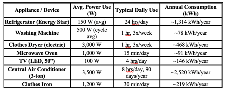 The table below summarizes the energy consumption of some of the most common household appliances.