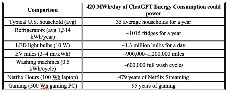 Realistically, if GPT-4o and 5 alone handle 700 million queries a day, that’s about 420 MWh daily. The table below summarizes the equivalent energy use by our daily tasks.