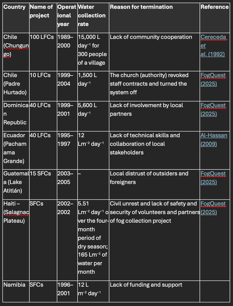 Fog fences depend on local climate and topography. Yields vary with weather, including El Niño events. Contamination from dust, birds, or mold poses risks. High setup costs, like those for CloudFisher systems, limit scalability.