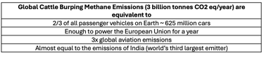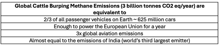 Several articles estimate that total methane production from livestock is 120 million tonnes/year (2021). With a Global Warming Potential for Methane (100 years) being 28x CO2 Equivalent, total equivalent CO2 emissions from cattle burping are 3 billion tonnes per year. This is the top-down approach. The bottom-up approach estimates that Methane released per cow per year is around 70-120 kg. Total CO2 equivalent/cow/year is 2 tonnes. As of 2023, the global cattle population is estimated to be 1.5 billion. This gives us a total CO2 equivalent from enteric methane emissions of 3 billion tonnes/year.