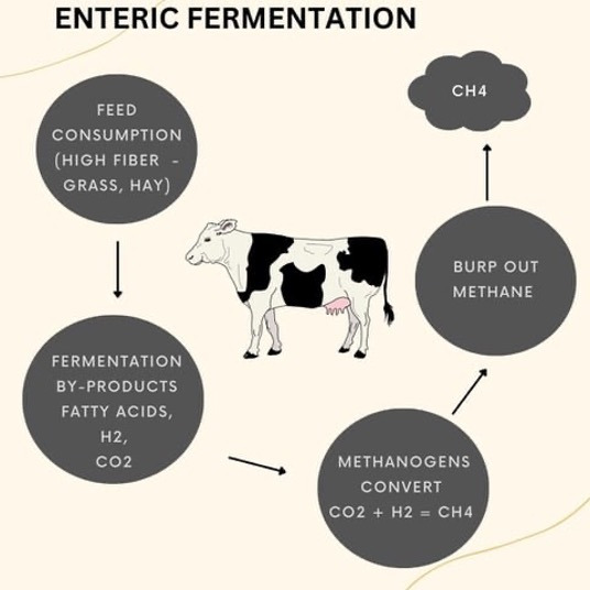 A refresher on the basic elementary school biology curriculum: cows, deer, sheep, and buffalo belong to a group of animals called ruminants. Ruminants are capable of ingesting a large amount of hay and grass and later digest it by regurgitating and rechewing. In the cattle’s stomach, rumen, a microbe that is a methanogen, converts the excess hydrogen and CO2 during this process to methane. This is enteric methane that is expelled from the cattle’s body as burping or belching.