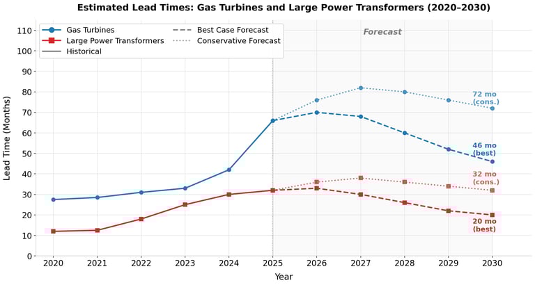 *The chart the conservative and the best-case scenarios for lead times on transformers and turbines based on market reports from Wood McKinzie, Bloomberg, and OEM forecast reports. The lead times are expected to ease in both the scenarios with the best case scenario showing a significant decrease in the lead times by 2030. The conservative scenario is a possibility if the bottlenecks and their actors persist. Nevertheless, development in alternate power technologies like fuel cells, renewables and batteries, and nuclear will ameliorate the impact of these 3T bottlenecks.