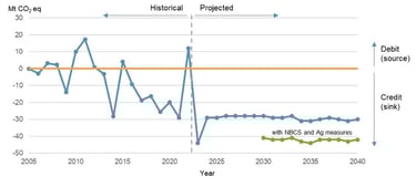 Figure - Historical and projected LULUCF accounting contribution (including reflecting the projected impact of Nature-based climate solutions (NBCS) and Agriculture measures for the period 2030 to 2040), (Mt CO2 eq)