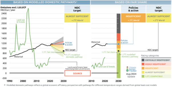 Future Plans: Brazil’s future climate strategy is now heavily focused on reversing deforestation and promoting sustainable land use, as well as on a wider energy transition. A core part of this plan is a new emphasis on multi-level governance, integrating climate action from the federal level down to states and municipalities. With Brazil set to host COP30 in 2025, the country is positioning itself to be a leader in the global climate conversation, with its success being a key determinant of whether the world can meet its long-term temperature goals. The image below shows the projected emissions.