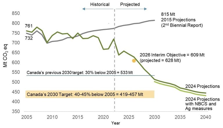 Current Status (2025): Canada has successfully "bent the emissions curve," decoupling economic growth from emissions. Its emissions are now tracking downwards, though meeting its ambitious goals remains a challenge. The government published its first Biennial Transparency Report under the Paris Agreement in 2024, providing a detailed look at its progress and projections.