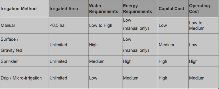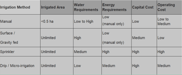 The following table provides guidance on selecting irrigation technologies based on key criteria, including production scale, energy source, and budget.