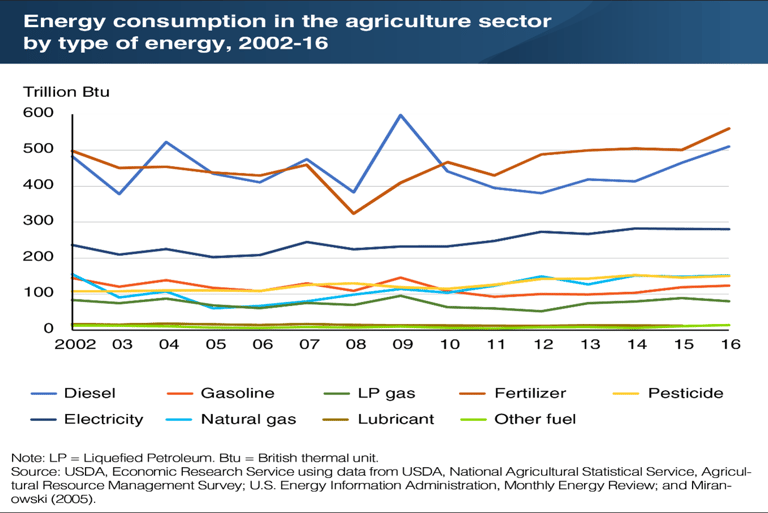 Mechanization is a key input in any farming system, as it involves applying tools, implements, and machinery to enhance the productivity of farm labor and land. Farms consume energy in many forms, mainly diesel (44 percent of direct energy consumption), electricity (24 percent), natural gas (13 percent), gasoline (11 percent), and liquefied petroleum gas (7 percent).